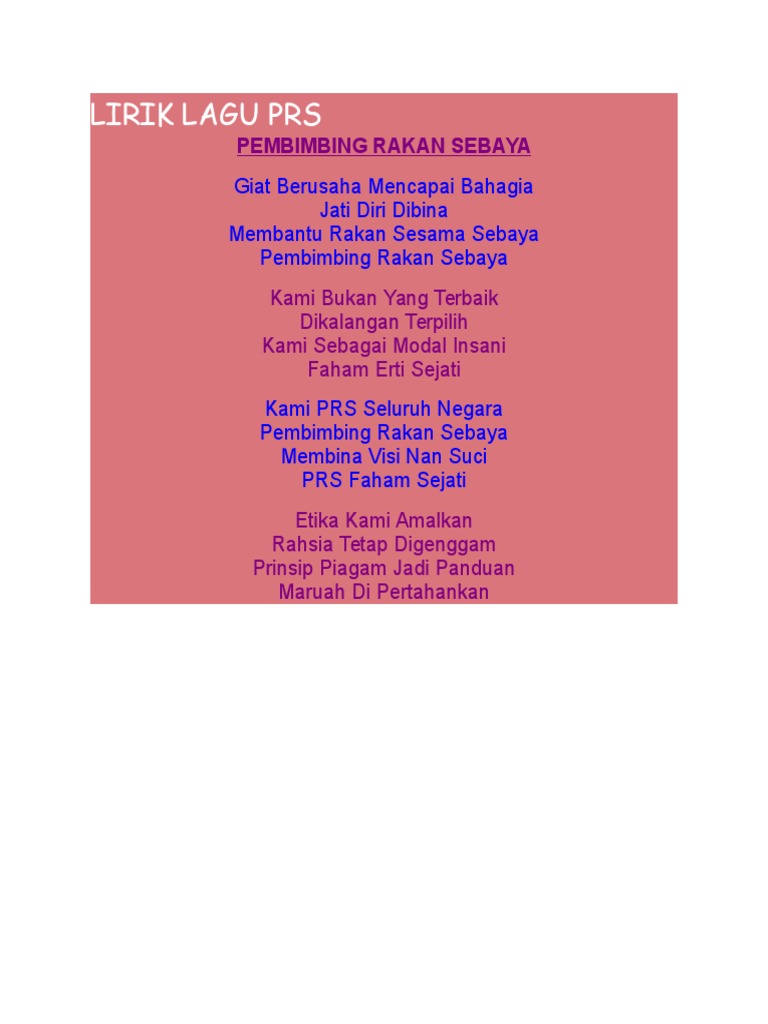 Lirik Lagu Pembimbing Rakan Sebaya Prs Youtube